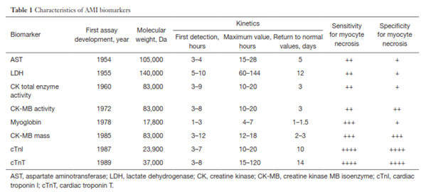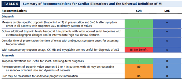 The recommendations for the use of cardiac biomarkers in the diagnosis and prognosis of MI was well summarized in Table from 2014 AHA/ACC guidelines p. 2655 (Amsterdam et al., 2014):