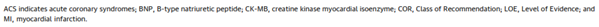 The AHA/ACC guideline considered all recommendations in the use of cardiac biomarkers for ACS prognosis as level of evidence B. They considered the presence and magnitude of troponin elevations useful for short- and long-term prognosis. The re-measurement of troponin once on day three or four in patients with MI was considered reasonable to estimate the infarct size and dynamics of necrosis. Finally, they considered the use of B-type natriuretic peptide to be reasonable for additional prognostic information.