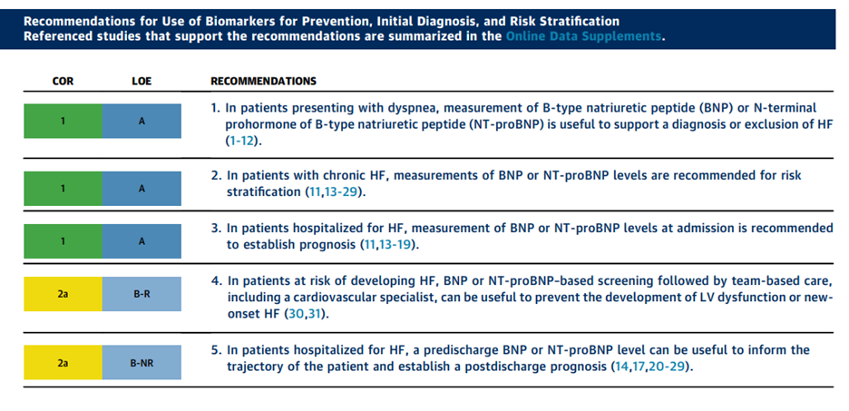 - “Class I recommendation (Level of Evidence: A) for measurement of natriuretic peptide biomarkers in patients presenting with dyspnea, to support a diagnosis or exclusion of HF.”